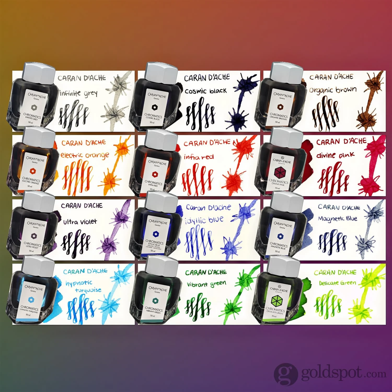 Caran D’ache Refills Chromatics Infinite Grey Bottled Ink – CA-8011005 The new Caran dAche ink bottles synthesize a unique expertise: the science of colors. Chromatics INKredible Colors Collection uses Caran dAches color experience to master the most intense pigments across a spectrum of 12 vibrant shades. Each one has a definite character that reflects the technical expertise of Caran dAche in creating a rich chromatic range. From Idyllic Blue to Vibrant Green these inks give the written word soul and the text a uniquely vibrant style.