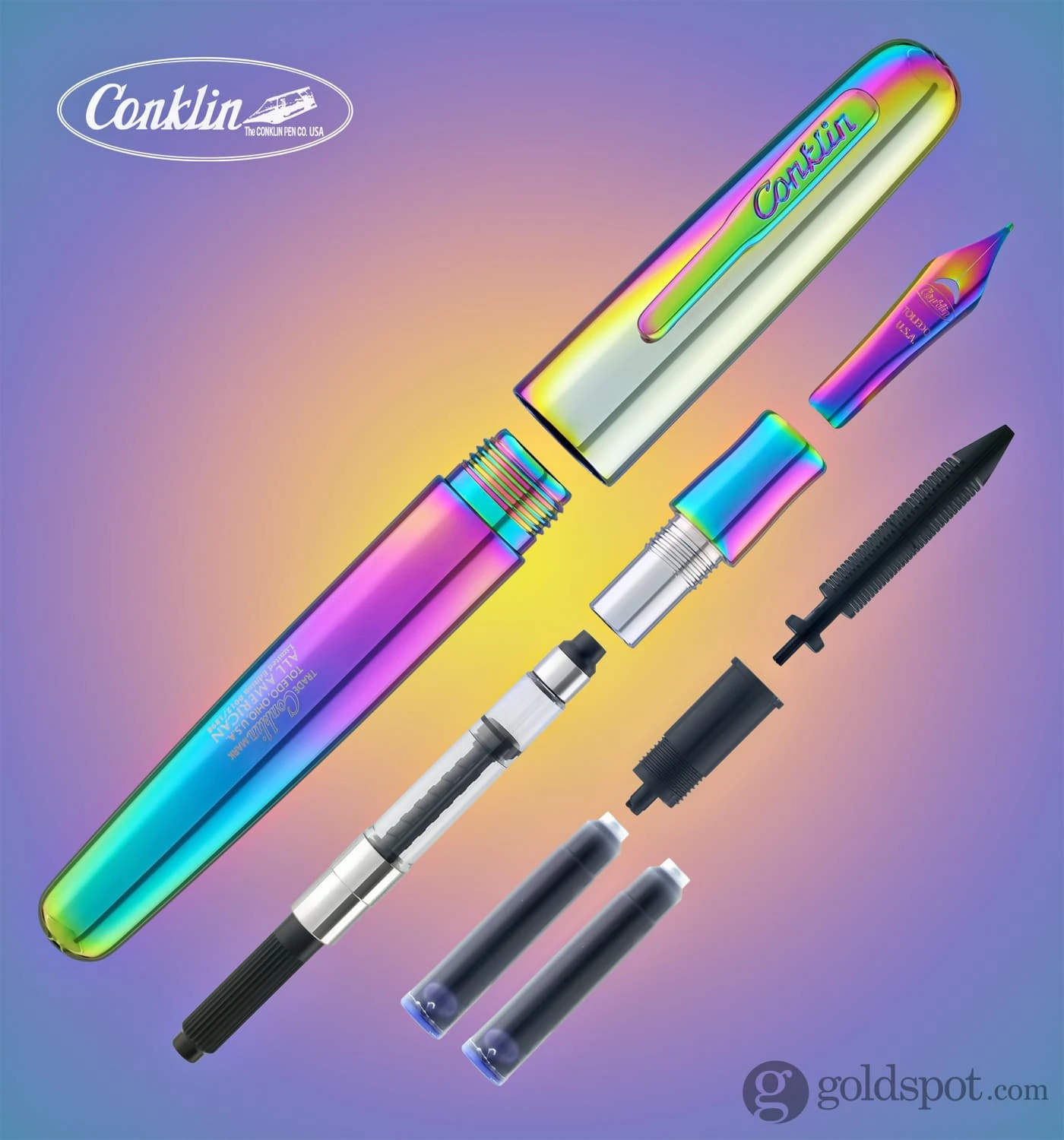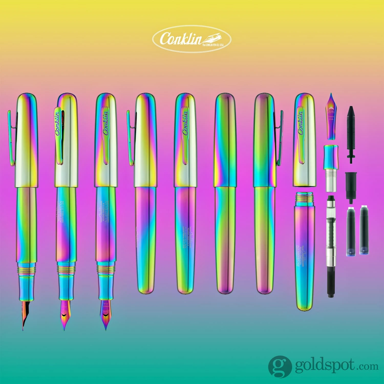 The Conklin All American in Rainbow is made of a rainbow PVD plating over brass, accented by rainbow trim. The Conklin All American has a grand size to match its vibrant personality. Named after a vintage Conklin designed in the 1930’s, the All American brings pen design back to a simple, classic style. Conklin designed the large pen in European grade resin that is appealing to see and touch. The pen may be large, but it is well designed with enough taper to provide a good balance in-hand. A signature Conklin “rocker” clip adds a bit of vintage flair to the top of this rounded-profile pen.