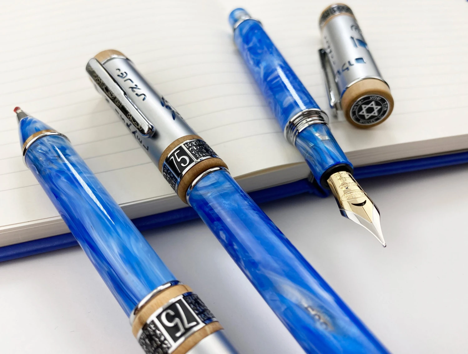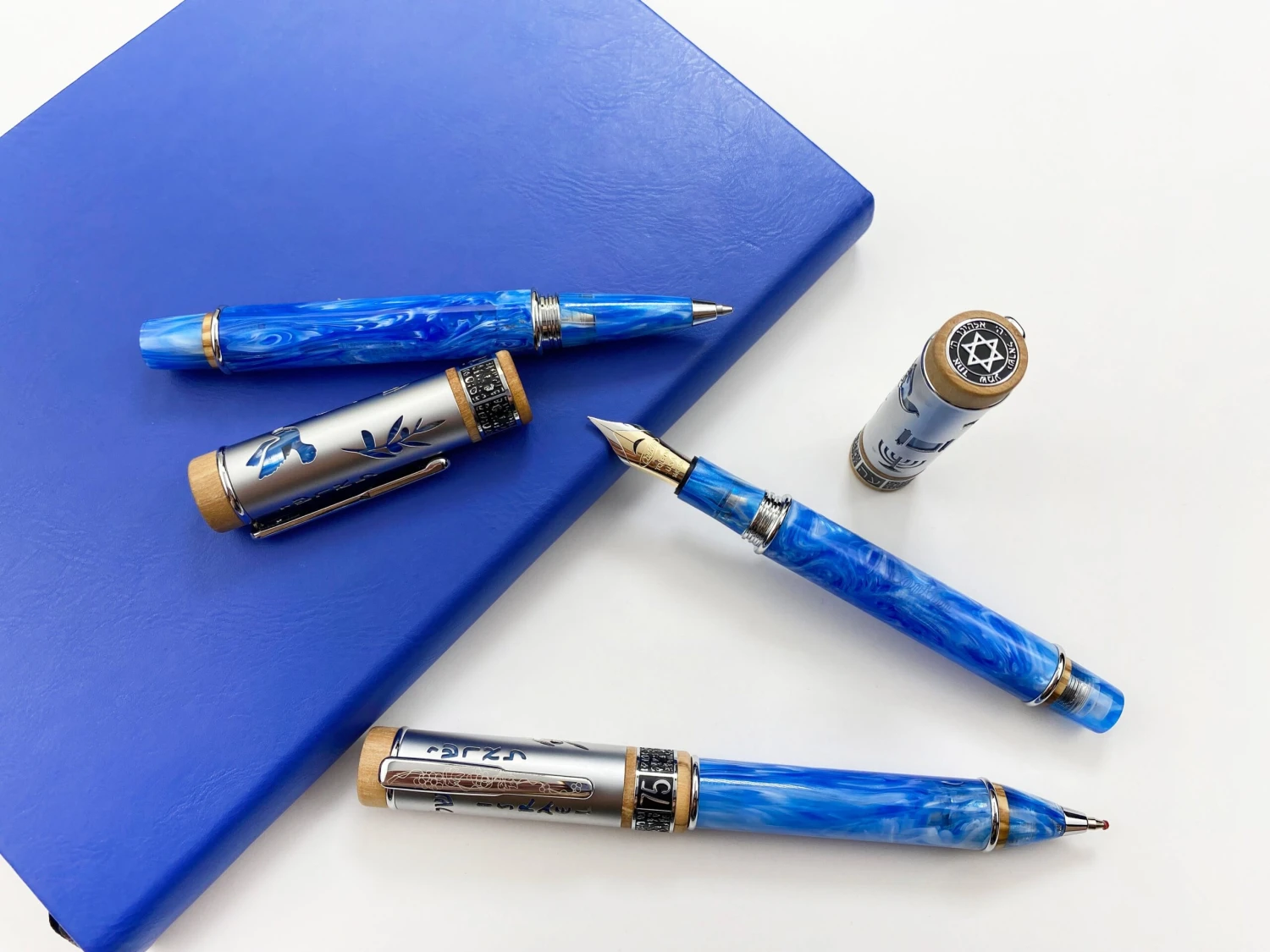 Conklin® is proud to introduce the Israel 75 Anniversary Diamond Jubilee (a special anniversary celebration) Limited Edition 1948 Collection, a revitalized design of a vintage Conklin classic, a fountain pen, a rollerball and a ballpoint collection. Exceptionable to look at and even better in hand, the Israel 75 is as unique as it is stunning. Machined to perfection and scrupulously hand-polished, the Israel 75 body features one of a kind high-graded blue and white resin, olive wood, and is then adorned with striking chrome accents along the overlay, clip and rings. Made with elaborate attention to details, each writing instrument is a visual representation of the country. Beautiful satin chrome plated overlay out of which a design is carved, showing the custom-made resin underneath displays main symbols of cultural values: words Israel and (Israel in Hebrew); a dove and an olive branch, recognized throughout the world as a token of peace; the seven-branched Menorah, symbolizing the seven days of Creation; the Hebrew word Shalom, meaning “Peace” (one of harmony and contentment, in complete peace); the Torah, representing the core of the Jewish spiritual and religious tradition. Located along the olive wood top of the cap is an intricately engraved coin with the Star of David encircled by the Shema Yisrael (the centerpiece of the daily morning and evening prayer services) that reads Hear O Israel, the Lord is our God, the Lord is One. The clip is etched with a grape vine design on it as a symbol of the Tree of Life. The band of Israel 75 incorporates the sacred Western Wailing Wall (Kostel in Hebrew), long believed to be the