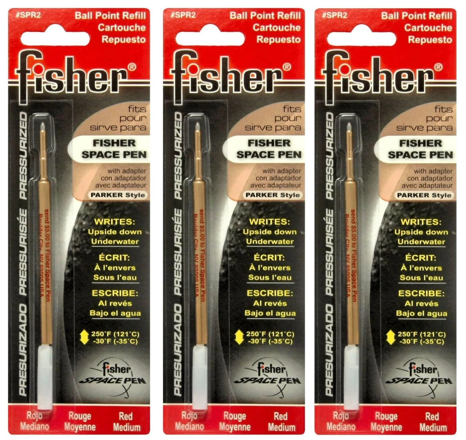 3 Pack of Fisher Space Pen medium tip refills. These are brand new individual packs of refills manufactured by The Fisher Space Pen Company. These refill will fit the Fisher Bullet and all other Fisher Space pens except for the Multi-Function Triple Action Fisher pens.