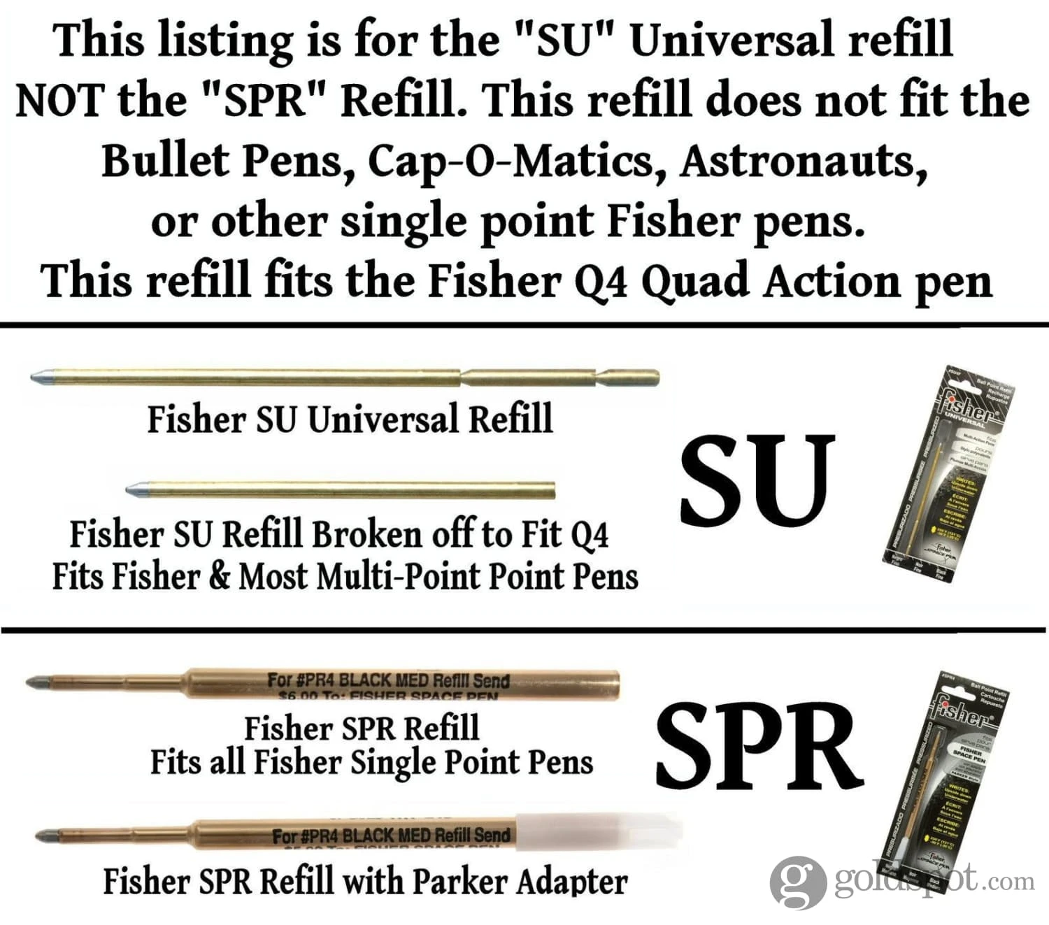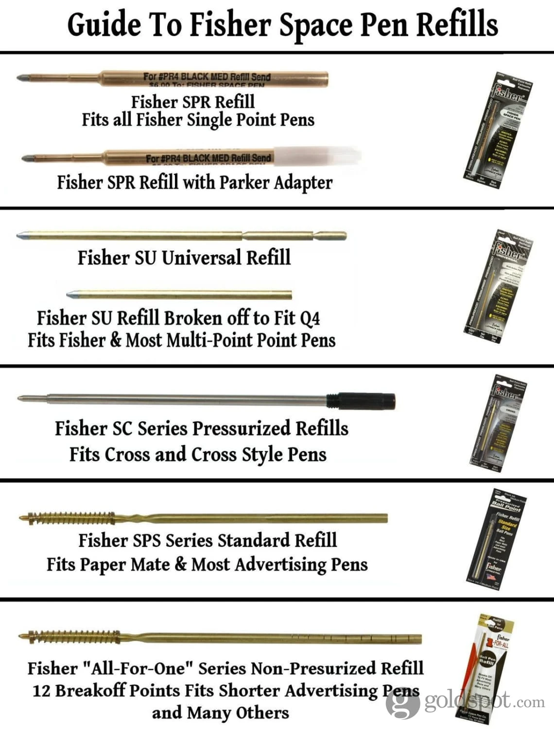 The Fisher Universal Pressurized Cartridgesare designed to fit onlyMulti-Action Ballpoint Pens like (TAN, TAN-S, G4, Q4 etc). These refills will not fit Sensa Pens. Please select the regular Fisher or Sensa Ballpoint for those pens. The Fisher universal refill comes in blue, black and red.Designed for NASA space missionsthis unique pressurized refill write upside down, under water, in gravity free space, over glossy surfaces and in extreme temperatures.