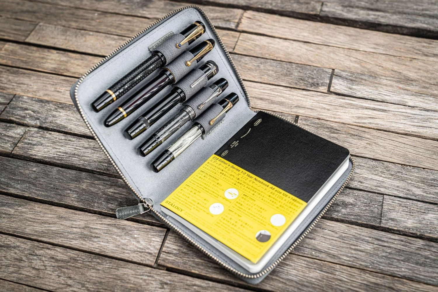 This Leather Zippered 5 Pen Case in smoky grey has a velvet lined interior. When you want to carry your favorite pens, you want them protected in your bag, purse or pocket to avoid ink leaking everywhere or getting them scratched. This leather pen holder is great to protect your fountain pens and keep them safe.  Pens are not included
