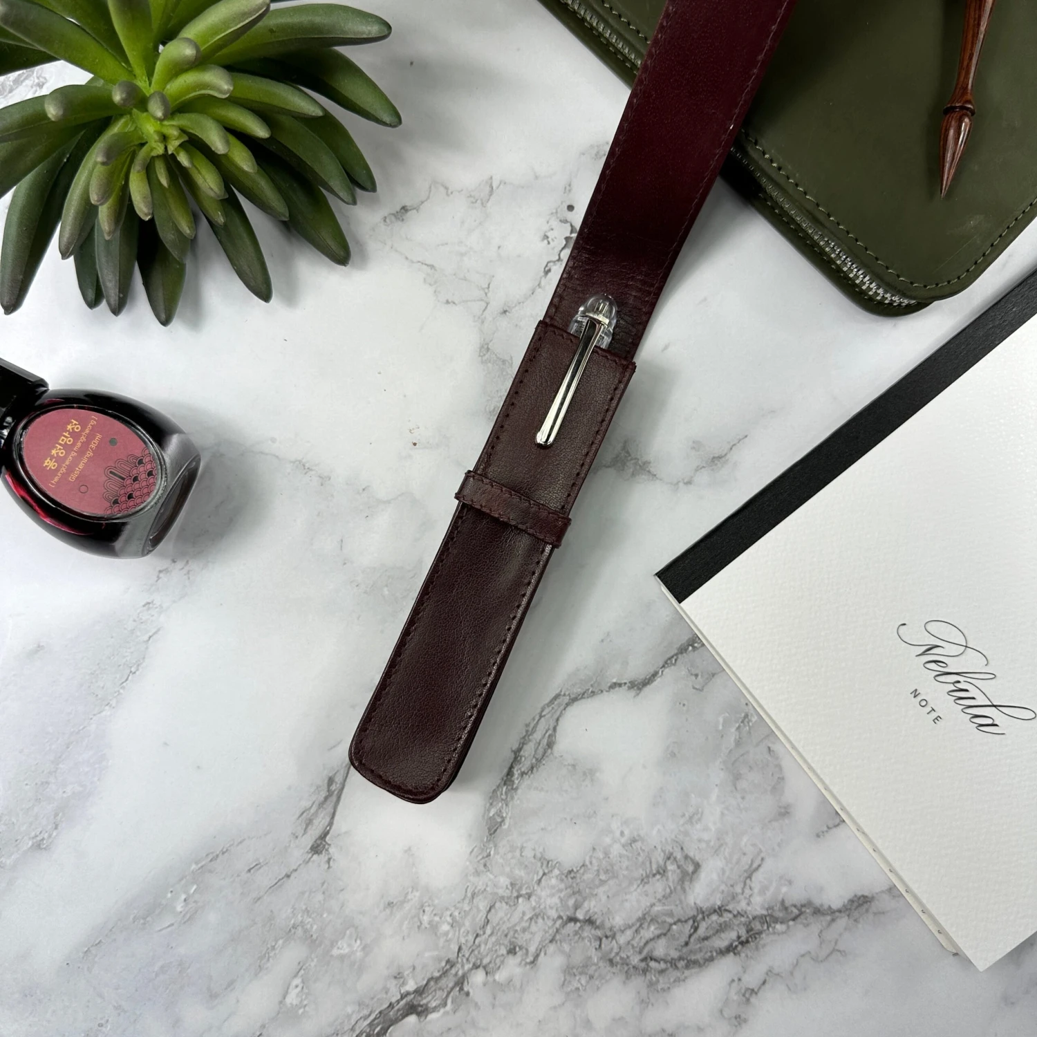 The single pen case in deep, oxblood red conveys your passion for writing. This leather color fits well with pens that have warm tones.