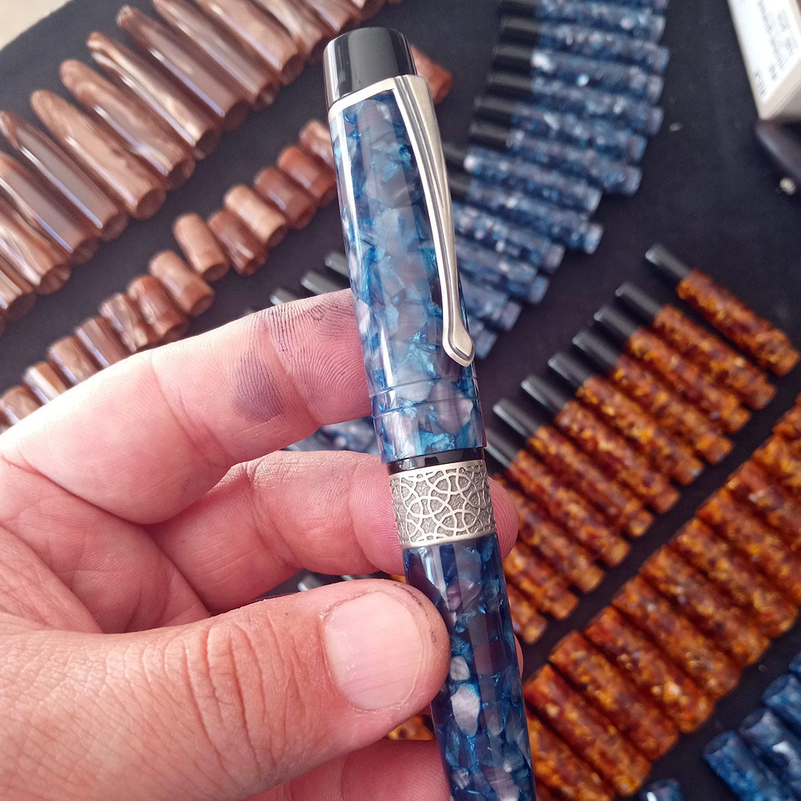 Staring up into the night sky and observing the cosmos, the blue marbled acrylic of the Celestial fountain pen inspires awe with its depth and color.