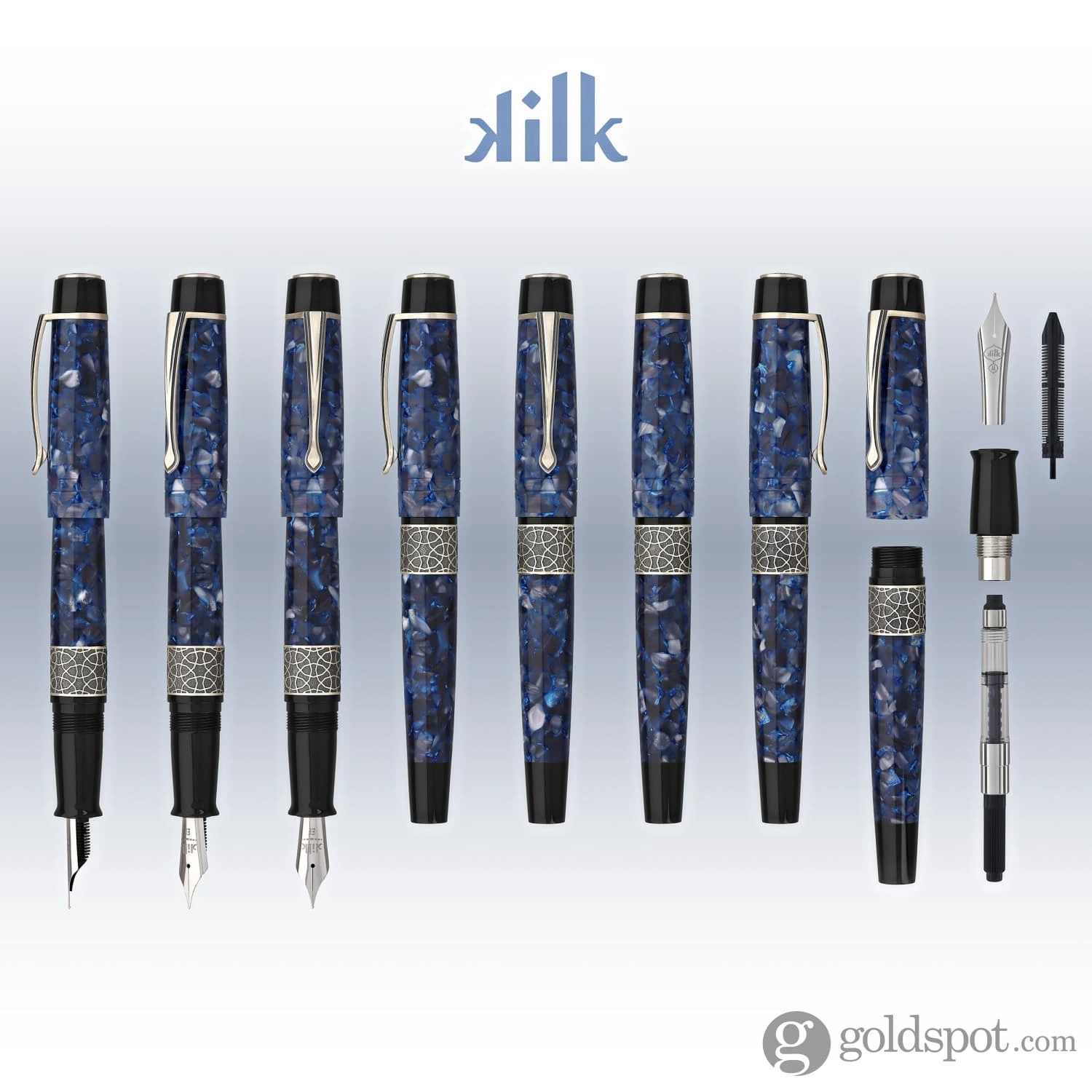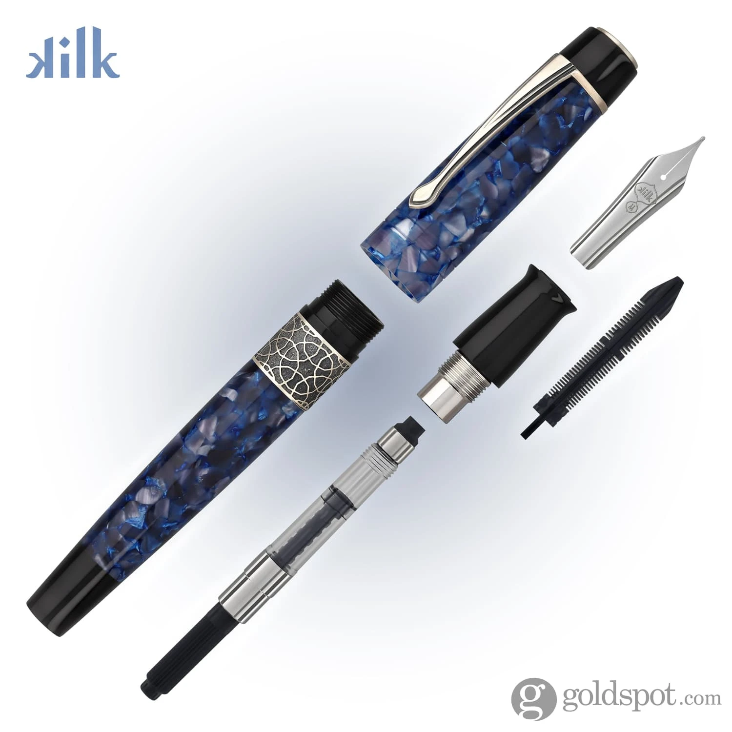 Kilk turns a solid bar of flecked blue and purple marbled acrylic resin into the proud shape of the Celestial pen. The aged, matte sterling silver metal appointments are made of a special alloy and hardened for durability. The #6 size stainless steel nib (from Bock, Germany) is fine-tuned to ensure a quality writing experience. The pen includes an international, threaded ink converter and may also accept international ink cartridges (sold separately).