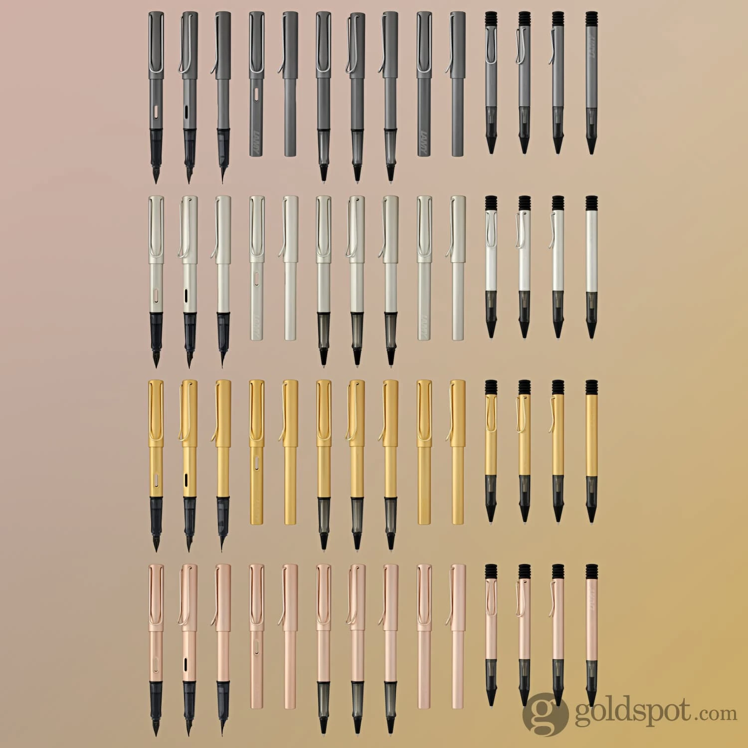 The Lamy Lx (pronounced “Luxe”) takes the bauhaus, contemporary design of the Lamy Al-Star and polishes its appearance with a modern, high-tech look. The lightweight aluminum body and cap are anodized with a luxury color inspired by precious metals. The signature wire clip is plated with a matching polished metal. See the inner mechanisms of your pen through the translucent smoky black front grip section. The section is molded to promote a proper grip for a comfortable writing experience. Each pen arrives in a matching aluminum cylinder gift case.