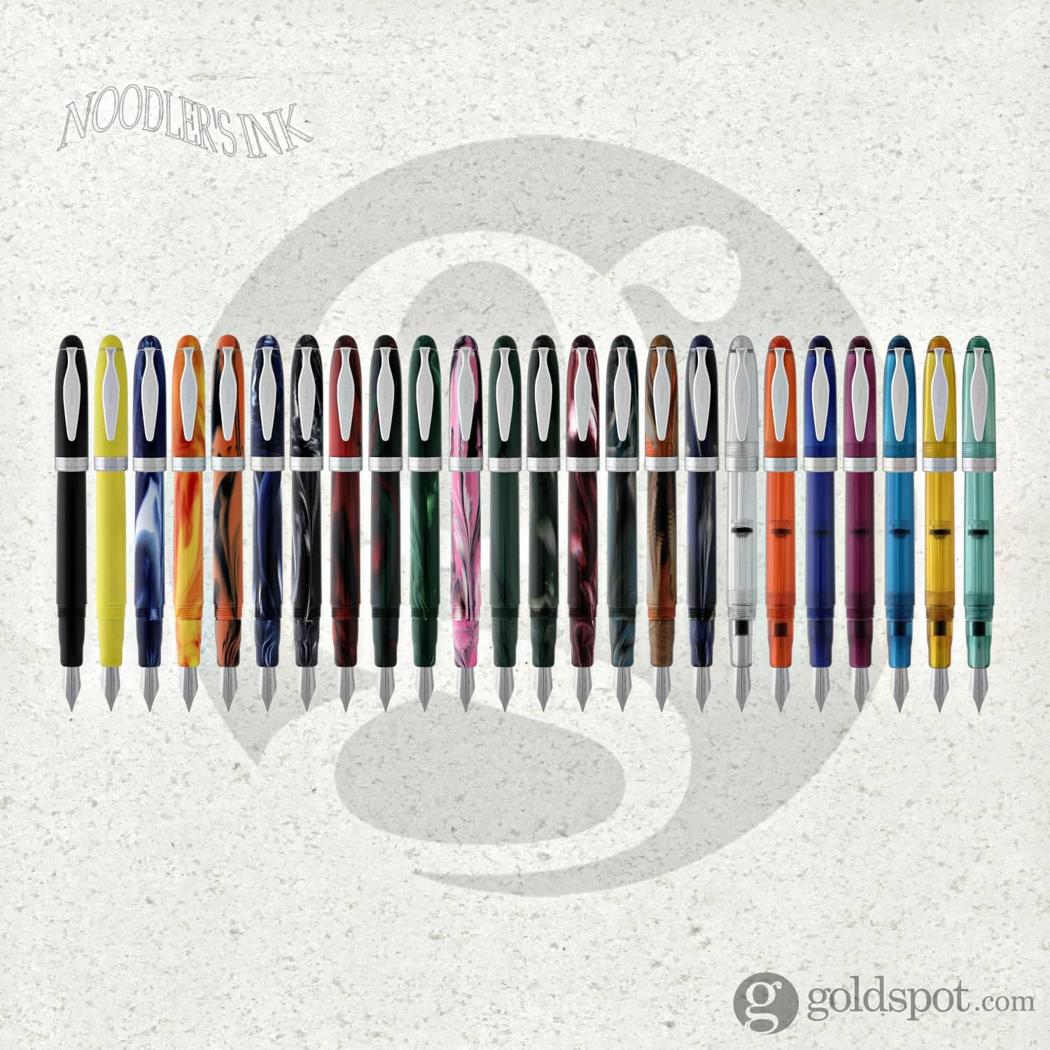 The Noodler’s Ahab flex pen is crafted from a celluloid derivative with its profile inspired by the shape of Ahab’s Great White Whale. The stainless steel nib is flexible ranging from a fine point to medium thickness with gentle finger pressure on the downstrokes. Larger in size than the Noodler’s Nib Creeper Flex nib the Ahab measures 5.47 closed (capped) and 6.7 with cap posted. Fills via ink pump or can also be used as an eyedropper fill. Cannot use ink cartridges to fill.