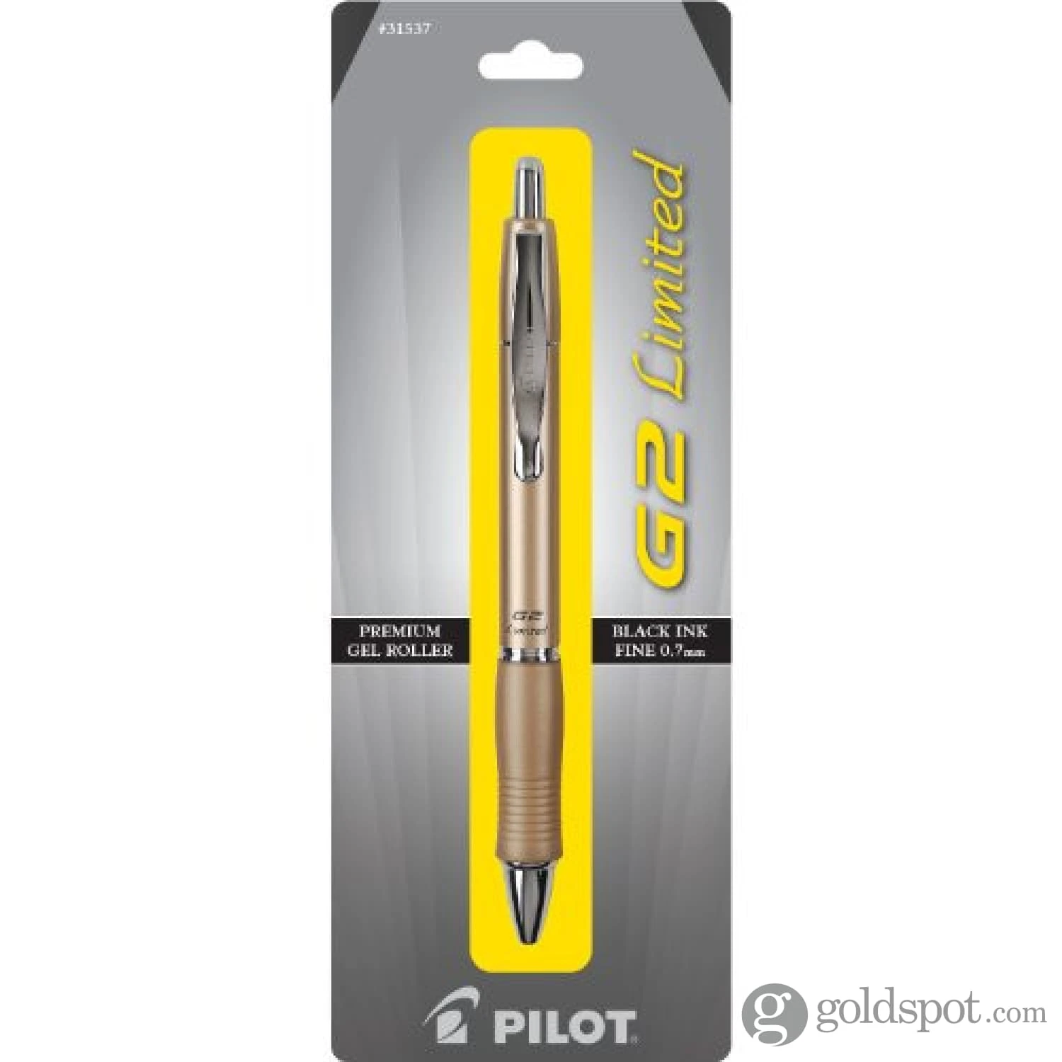 The Pilot G2 Limited Retractable Gel Rollerball Pen in Gold allows you to enjoy the writing quality of America’s #1 selling gel ink pen in a sophisticated grey metallic body with rich stainless steel accents. Experience an ultra smooth, long lasting writing experience in black ink with a fine (0.7 mm) point size.
