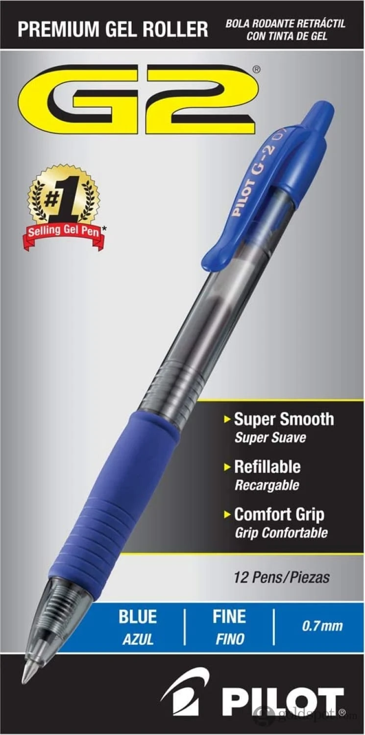 The Ideal Pen for Overachievers: The smooth writing, long-lasting Pilot G2 Retractable Premium Gel Ink Pen in Blue features a comfortable rubber grip, & is available in ultra fine, extra fine, fine, & bold point.