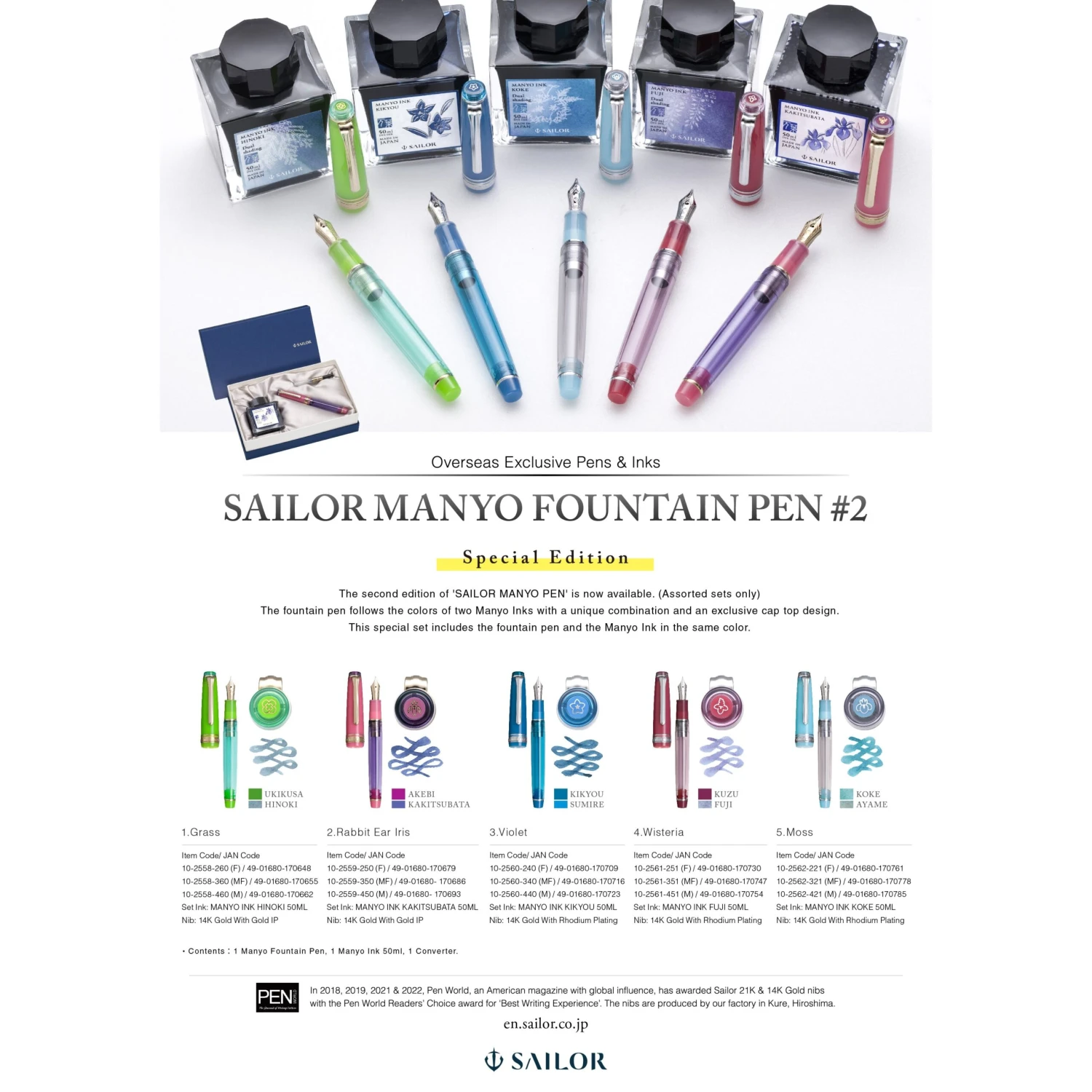 The new Sailor Manyo Fountain Pen #2 collection boasts exciting new color combinations that were developed to mimic pairs of Manyo ink colors and bring new color possibilities.