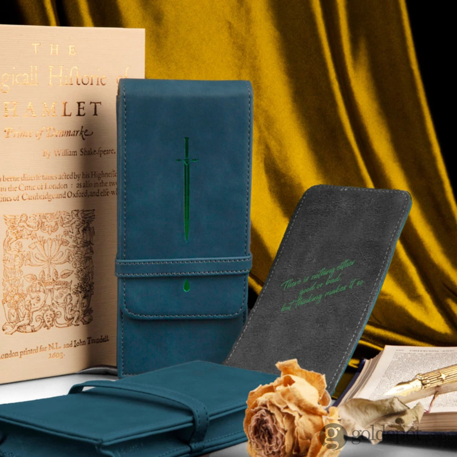 Introducing the Wearingeul 3 Pen Leather Pouch – “Hamlet” edition: a fusion of literary inspiration and exquisite craftsmanship. Crafted from premium sea blue leather and lined with light gray suede, this pouch combines luxury with functionality. Safely store three fountain pens or other small items in its compact yet spacious interior. The points of “Hamlet” are delicately engraved on blue leather with green foil, evoking the essence of Shakespeare’s timeless tragedy. The phrase “There is nothing either good or bad, but thinking makes it so” is silk-printed in gray suede, adding philosophical depth to the design. With eight captivating variations available, choose a pouch that reflects your unique style and appreciation for literature. Experience the artistry of Wearingeul and elevate your accessory game today!