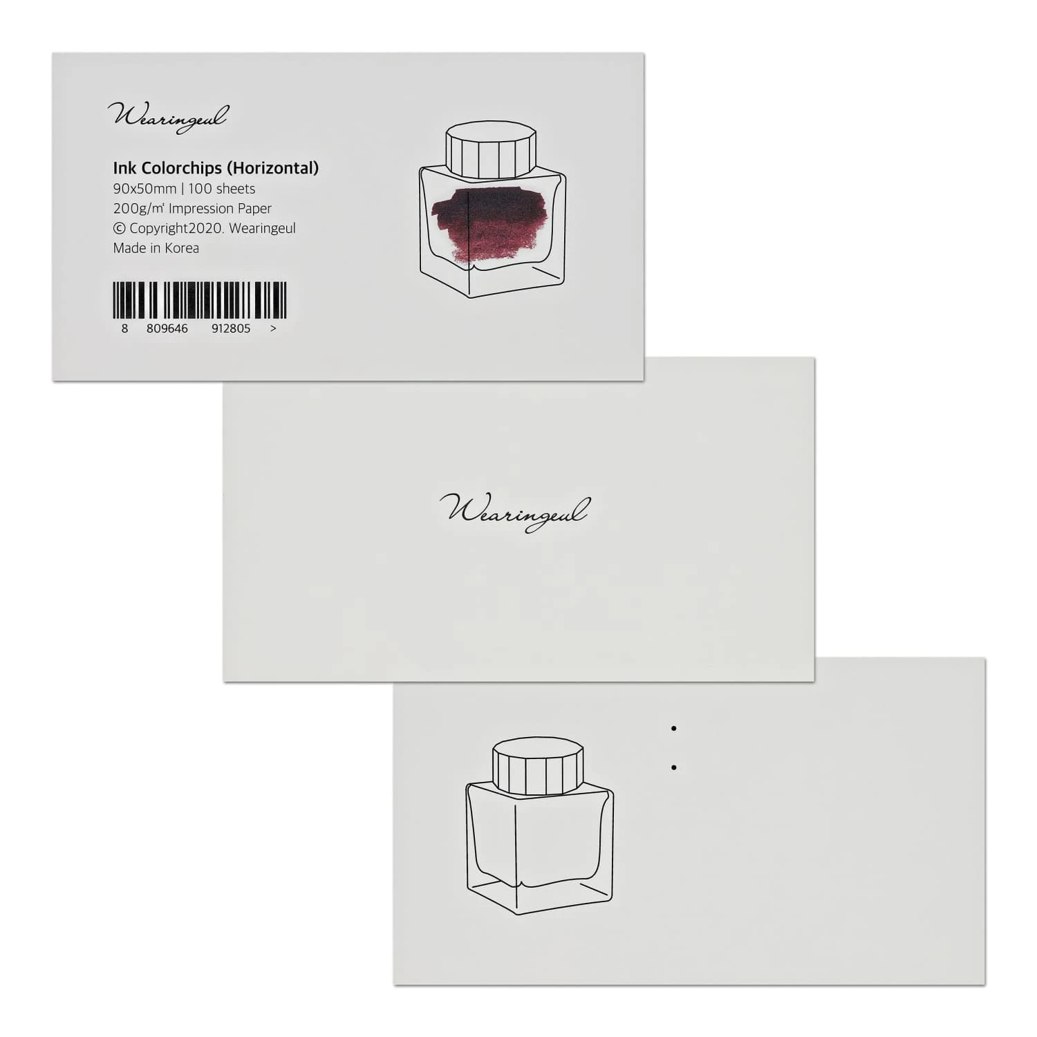 The horizontal Wearingeul Bottle ink swatch cards are made from 200gsm Impression paper, which is perfect for displaying various ink characteristics including shading and sheening.