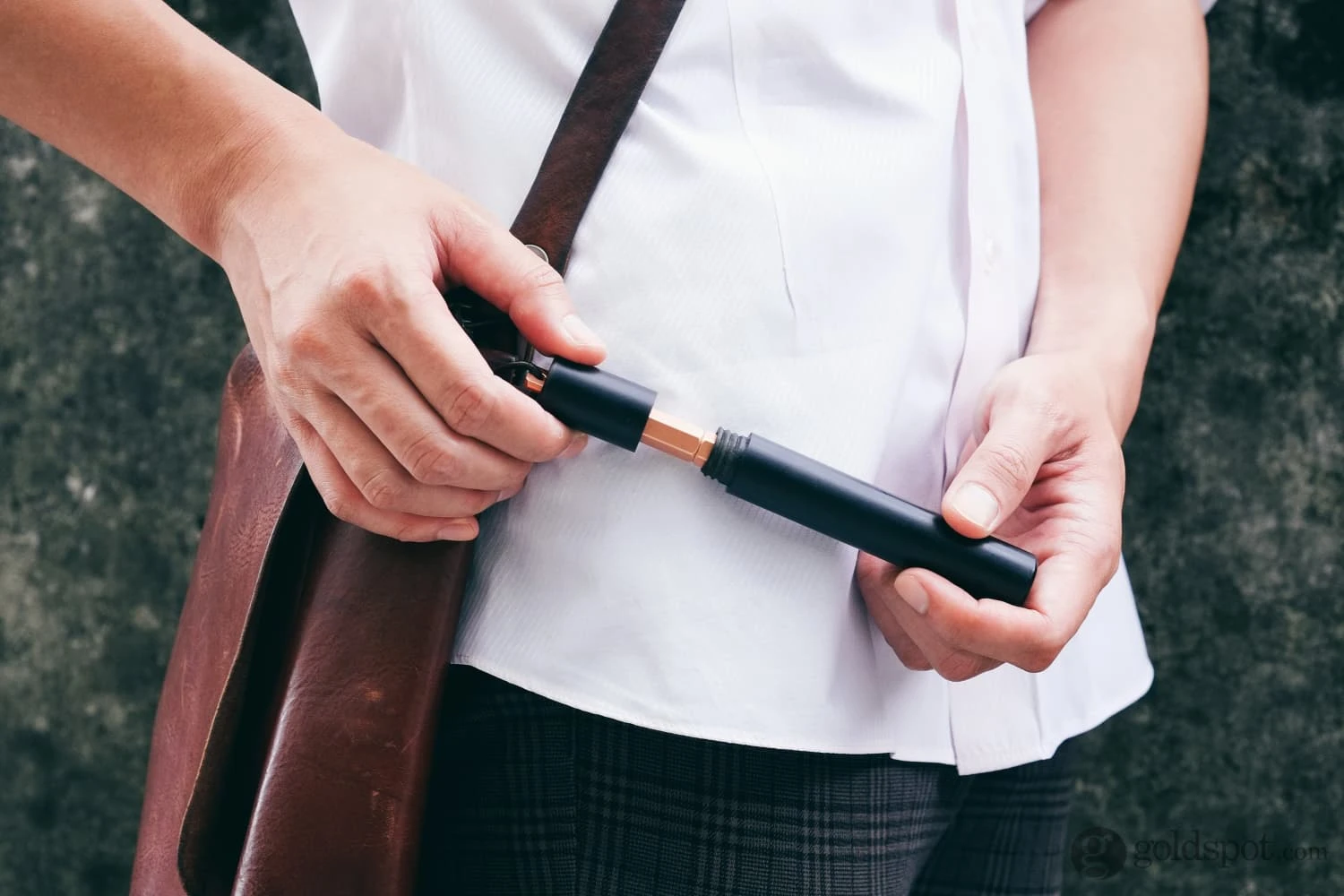 ystudio’s portable fountain pen creates a new way to bring your fountain pen with you. You can hang it on your bag and open it to start writing. The pen writes steady and smooth. The nib is from Germany Schmidt nib and it comes with Schmidt converter inside. It’s a true eye catcher and a great gift suggestion.